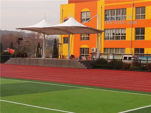 威海市,文登開發(fā)區(qū)實(shí)驗(yàn)小學(xué),膜結(jié)構(gòu)看臺,鋼材材質(zhì)Q235,膜布采用浙江星益達(dá)PVDF950克抗芯吸膜布。膜布特點(diǎn),抗腐蝕性抗發(fā)霉抗?jié)B透性超強(qiáng),適合空氣中酸堿度,鹽堿高的沿海,化工環(huán)境中使用。